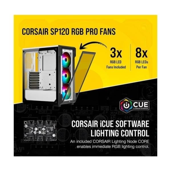 · المراوح المضمنة : يتضمن ثلاثة مراوح CORSAIR SP120 RGB PRO ، كل منها مبطنة بثمانية اضاءات LED قابلة للتغيير بشكل فردي حول المحور