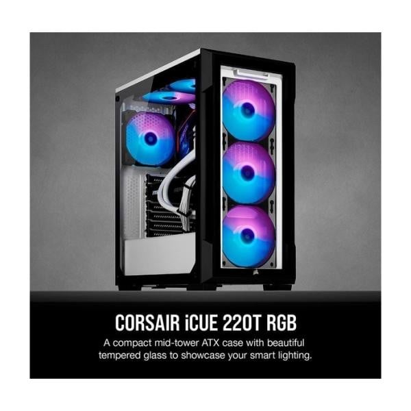 كورسير كيس iCUE 220T RGB Tempered Glass Mid-Tower Smart Case ابيضعبارة عن صندوق للكمبيوتر وحافظة ذكية ATX في منتصف البرج مع لوحين من الزجاج المقس...