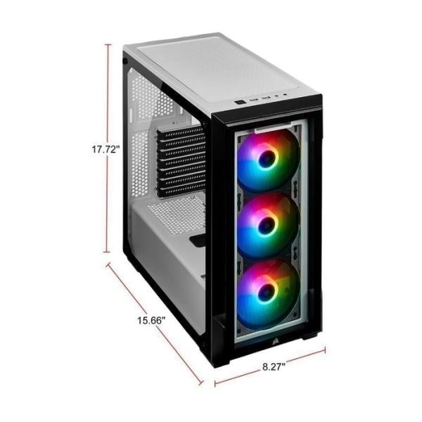 عبارة عن صندوق للكمبيوتر وحافظة ذكية ATX في منتصف البرج مع لوحين من الزجاج المقسّى وثلاثة مراوح SP120 RGB PRO مضمنة لإضاءة RGB مذهلة يتم التحكم فيها عبر برنامج CORSAIR iCUE.